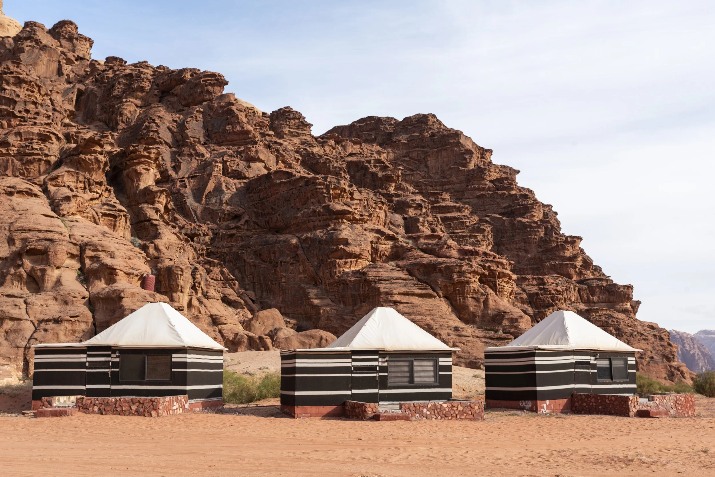 Campamento en el desierto de Wadi Rum con tiendas beduinas