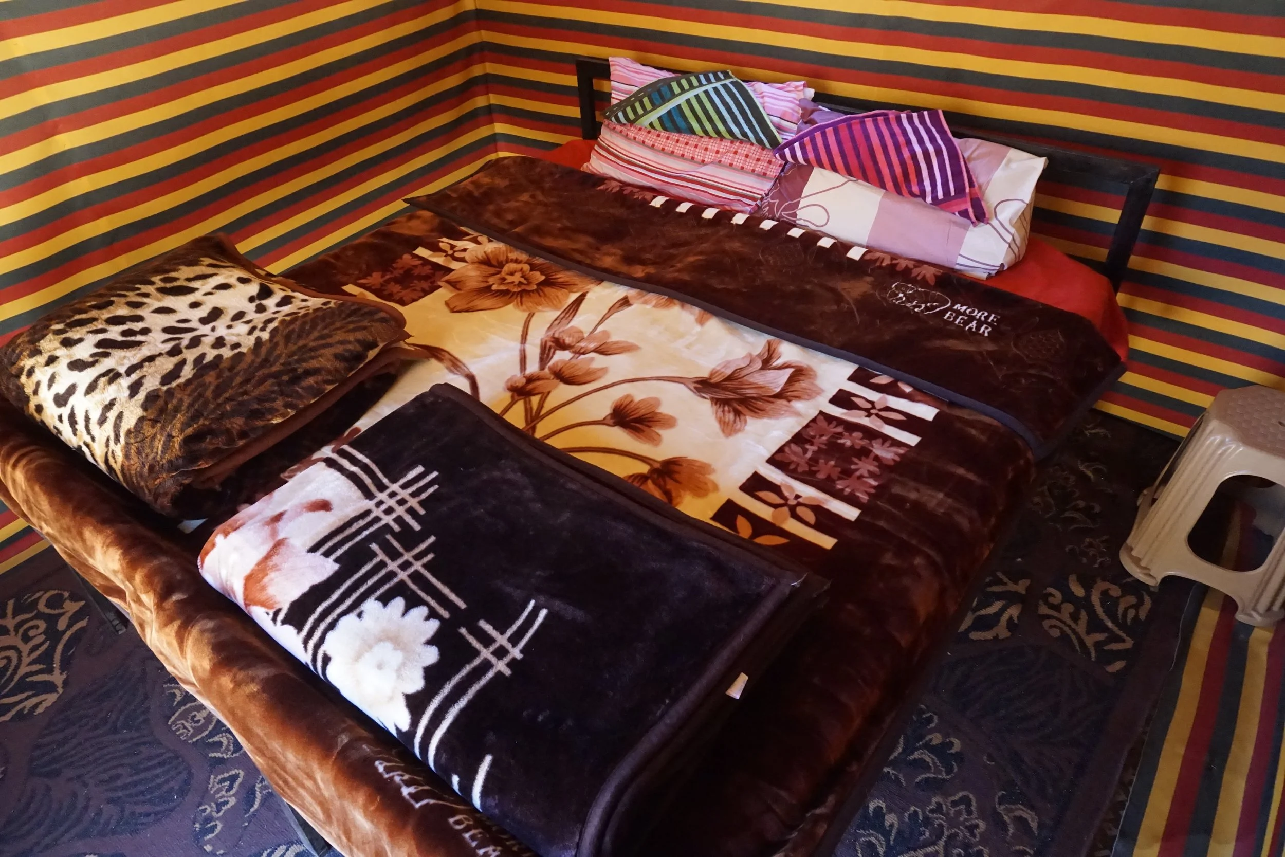 Todas nuestras tiendas tienen camas cómodas para dormir y muchas mantas calientes por si hace frío durante la noche.