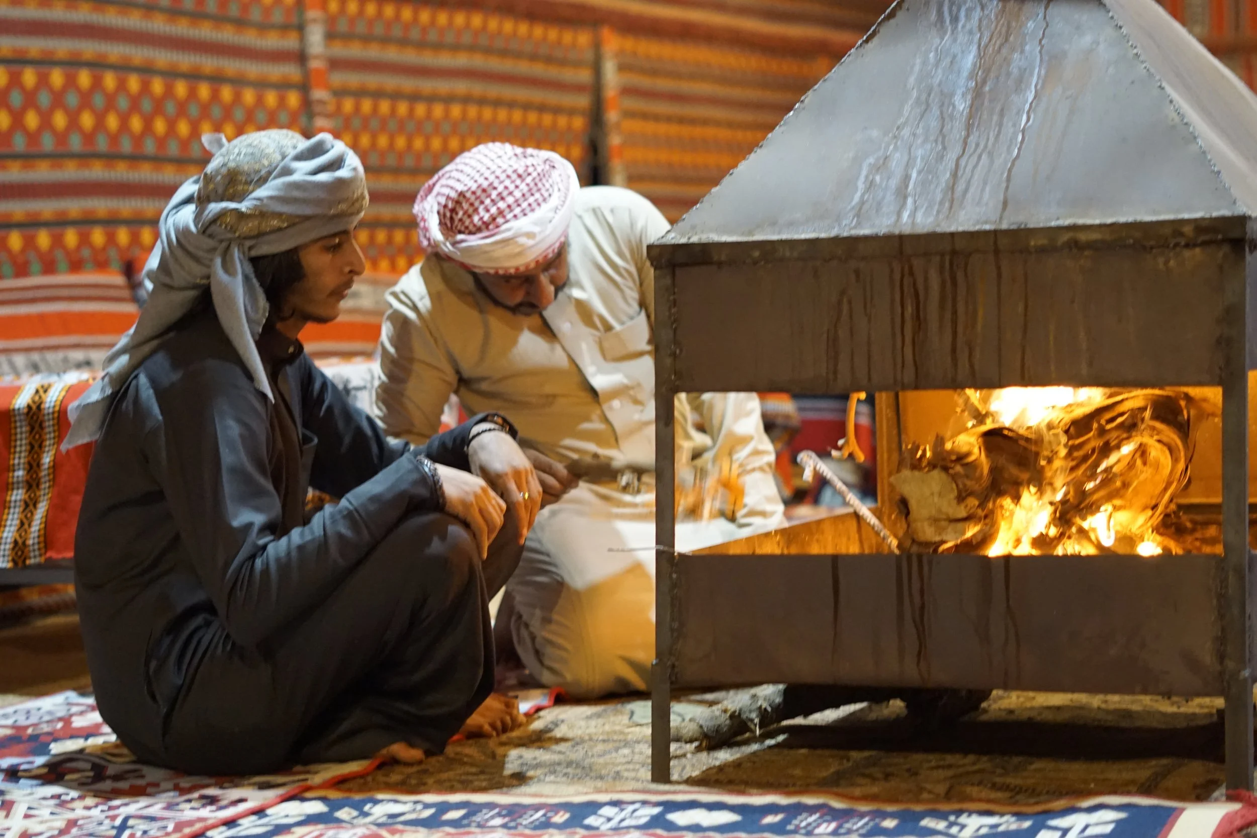 Les soirées au camp sont souvent un moment fort du séjour : thé bédouin, discussions autour du feu, ciel étoilé et silence du désert.