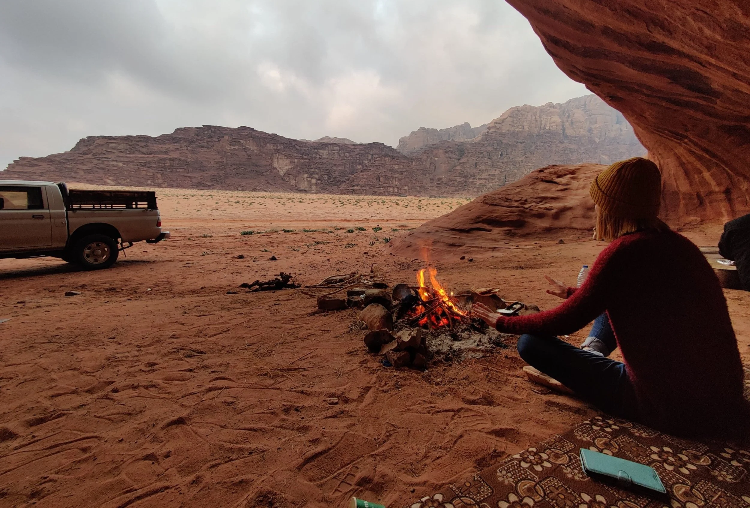 Here is a photo taken by one of our guests who did our Wadi Rum Jeep Tour with Sleeping Under the Stars. Your guide will set up a campfire as the sun is setting.